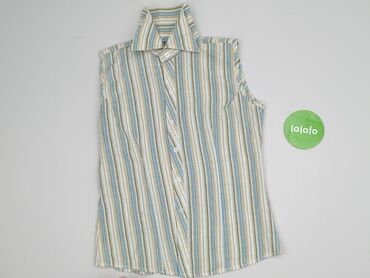 Koszula damska z krótkim rękawem - Krój: klasyczny, taliowany, z kołnierzykiem i zapięciem na guziki z przodu - Wzór: pionowe pasy w odcieniach bieli i jasnego błękitu (różna szerokość pasów, deli...