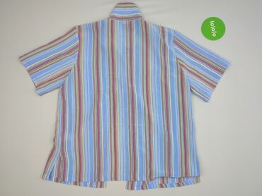 Koszula damska w paski, krótki rękaw - Krój: koszulowy, zapinana na guziki z przodu - Kołnierzyk klasyczny - Wzór: pionowe i skośne paski w odcieniach niebieskiego, bieli i jasnego beżu – optyczni...