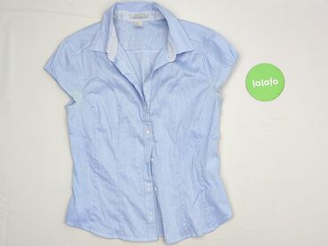 Koszula damska H&M - Krój: klasyczna koszula z kołnierzykiem, długi rękaw - Zapięcie: pełny rząd guzików z przodu; mankiety na guzik - Wzór: cienkie pionowe paski w kolorze niebieskim i białym - R...Stan: