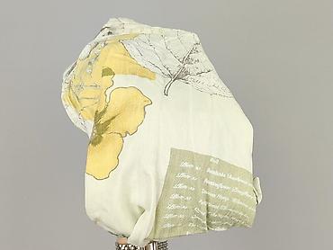- Wzór: patchworkowy, tropikalno-kwiatowy z nadrukami liści i napisów; odcienie kremu, seledynu, oliwki, żółtego i turkusu