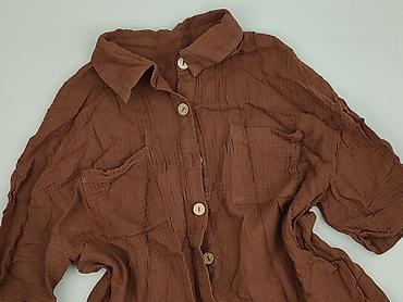 Damska koszula z miękkiej, marszczonej tkaniny (muślin/gauze), w ciepłym, ceglastobrązowym kolorze. Luźny, pudełkowy krój z krótkim rękawem i klasycznym kołnierzykiem. Zapięcie na drewniane guziki na całej długości. Dwie naszywane kieszenie na piersi. Lekka, przewiewna i przyjemna w dotyku – idealna na lato lub do warstwowych stylizacji.