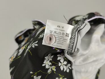 Bluzka damska z krótkim rękawem, w kwiatowy wzór - Rozmiar: S (EU 36, US 4) – na metce - Materiał: 100% poliester - Kolor: czarne tło z pastelowym, różowo-zielonym motywem kwiatowym - Krój: lekko ...
