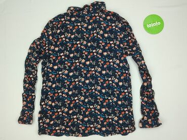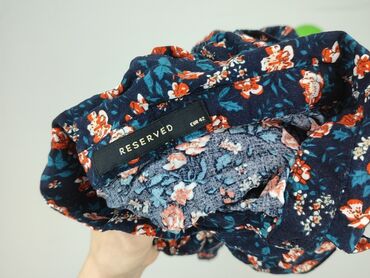 Bluzka damska marki Reserved, rozmiar 36. Cechuje się kwiecistym wzorem w odcieniach różu, bieli i zieleni na granatowym tle. Ma długie rękawy i głęboki dekolt w kształcie litery V, obszyty granato...