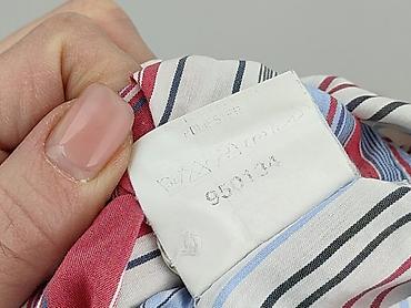Koszula damska Lustrin, rozmiar M - Wzór: granatowo-białe paski (pionowe i ukośne), efekt lekkiego marszczenia/crinkle - Fason: dłuższa koszula zapinana na guziki, zaokrąglony dół, długi rękaw z m...