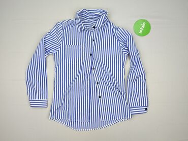 Koszula damska w paski - Krój: luźny, z opuszczoną linią ramion; tył nieco dłuższy niż przód (zaokrąglony dół) - Wzór: wąskie, pionowe paski w kolorze niebieskim i białym - Zapięcie: półplisa na g...