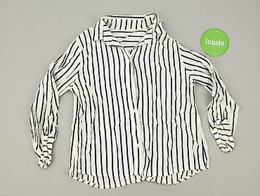 Koszula damska w paski, rozmiar XL - Fason: klasyczna koszula zapinana na guziki, długi rękaw, kołnierzyk. - Wzór i kolory: patchwork pasków – biel z granatowymi i błękitnymi liniami, szeroki gran...
