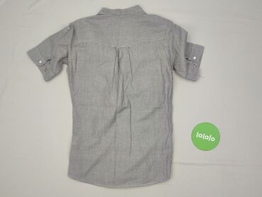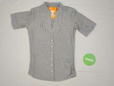 Damska koszula w paski Forget Me Not - Krój: taliowana, zapinana na guziki z przodu - Rękaw: krótki, zakończony mankietem - Kołnierzyk: klasyczny - Wzór: drobne, białe i granatowe paski - Rozmiar ...Stan: