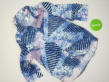 Rękaw 3/4Damska koszula w wielobarwny, geometryczno-abstrakcyjny wzór (odcienie granatu, błękitu, bieli i pudrowego różu). Zapinana na guziki, z kołnierzykiem i mankietami na guzik. Lekka, przewiewna, z dłuższym, zaokrąglonym dołem – świetna do jeansów, spódnic i pod marynarkę.