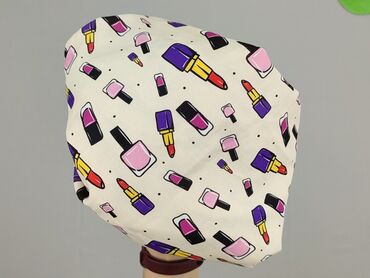 - Wzór: kremowe tło w zabawny print kosmetyczny – szminki, lakiery do paznokci i błyszczyki w odcieniach różu, fioletu, czerwieni i czerni; drobne kropki.