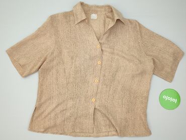 Beżowa koszula damska z krótkim rękawem - Krój: luźny, lekko taliowany panelami, długość do bioder - Zapięcie: rząd perłowych guzików z przodu - Kołnierz: szeroki, rewersowy z ozdobnymi, potrójnym...