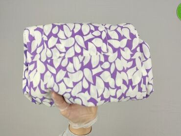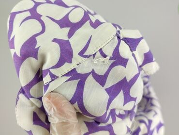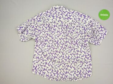 Krótki rękawDamska koszula z krótkim rękawem, zapinana na guziki. Wzór w liście/krople w kolorach bieli i fioletu. Klasyczny kołnierzyk, na przodzie naszywana kieszonka. Luźniejszy, komfortowy krój z delikatnie zaokrąglonym dołem, miękki i lekki materiał (cienka tkanina o drobnej fakturze). Subtelne marszczenia na karczku z tyłu poprawiają układanie się koszuli. Na jednym z rękawów widoczne niewielkie zaciągnięcie przy szwie (pokazane na zbliżeniach). Idealna do stylizacji casualowych i letnich. Kategoria: damska, dla dorosłych. Stan: używane.
