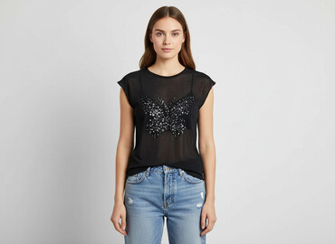 Czarna koszulka damska z krótkim rękawem, wykonana z mieszanki poliestru i elastanu, co zapewnia wygodę noszenia. Centralnie umieszczona dekoracja przedstawia motyla z białymi, marszczonymi skrzydł...