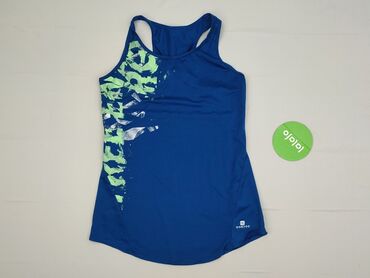 OkrągłyDamska koszulka bez rękawów w odcieniu niebieskim, idealna do aktywności fizycznej. Posiada dopasowany krój i zaokrąglony dekolt, a jej tył jest w stylu "racerback", co zapewnia swobodę ruchów. Przód koszulki ozdobiony jest abstrakcyjnym wzorem w odcieniach limonki i bieli, nadając jej dynamiczny wygląd. Materiał jest lekki i przewiewny, doskonały na treningi lub na co dzień.