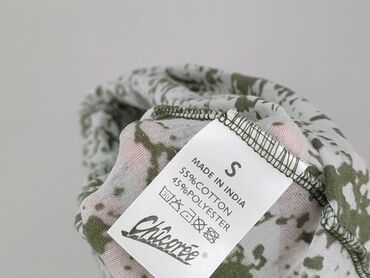 Damska koszulka z krótkim rękawem w rozmiarze S, o luźnym kroju i dekolcie w kształcie litery V, z krótkimi rękawami, ozdobiona jaskrawym, abstrakcyjnym wzorem w motywy tropikalne. Utrzymana w żywy...