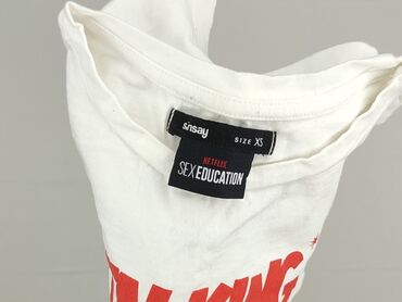OkrągłyKoszulka damska marki Sinsay w kolorze białym, z krótkim rękawem i okrągłym dekoltem. Na przodzie widnieje czerwony nadruk "TALKING ALWAYS HELPS", a na karku czarny napis "SEX EDUCATION". Koszulka w rozmiarze XS.