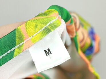 Przewiewna bluzka damska z dekoltem w serek w kształcie litery V, ozdobiona barwnym, tropikalnym wzorem liści. Rękawy o rozszerzanym kroju sięgają do łokcia, a dół i dekolt wykończone są ściągaczem...Stan: