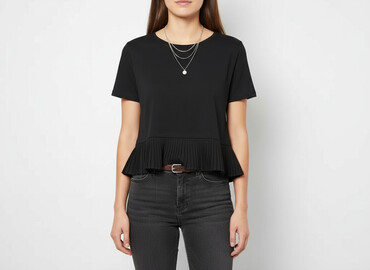 Uniwersalny, minimalistyczny top do łączenia z jeansami, spódnicą lub eleganckimi spodniami; plisowana falbana dodaje lekkości i urozmaica prosty krój.