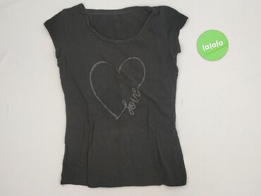 Damska koszulka z krótkim rękawem, czarna, rozmiar M. - Fason: dopasowany, okrągły dekolt. - Nadruk: małe serduszko i napis w kółku przy lewej piersi („all you need is love and peace” – widoczne na...