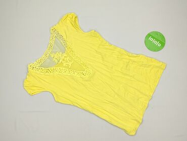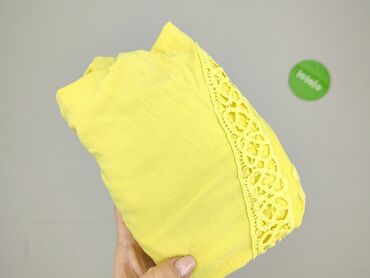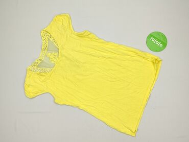 Żółta bluzka damska z krótkim rękawem - Krój: luźny, z lekkim wcięciem w talii i dekoracyjnym wiązaniem z przodu, dół lekko falowany/peplum - Dekolt: łódkowy - Rękawy: krótkie - Materiał: cienka, ...
