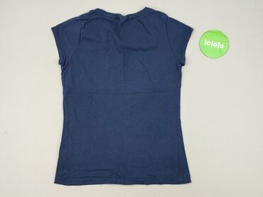 T-shirt damski BELONE WOMAN, rozmiar M. - Kolor: granatowy - Krój: klasyczny, z krótkim rękawem i okrągłym dekoltem - Przód zdobiony nadrukiem botanicznym w odcieniach niebieskiego oraz dwoma ptak...