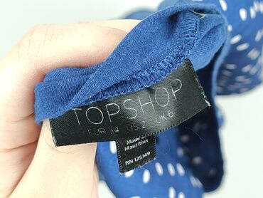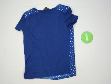Bluzka damska w groszki - Fason: lekko taliowany T‑shirt z krótkim rękawem, okrągły dekolt z delikatną zakładką z przodu - Wzór: drobne granatowe kropki na białym tle - Materiał: 95% poliester, 5%...