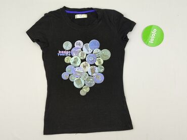 Damska koszulka z krótkim rękawem, czarna, ze zdobieniami 3D - Fason: dopasowany T‑shirt z okrągłym dekoltem - Kolor: czarny - Grafika/przód: duży nadruk postaci z elementami 3D – cekiny, koraliki...Stan: