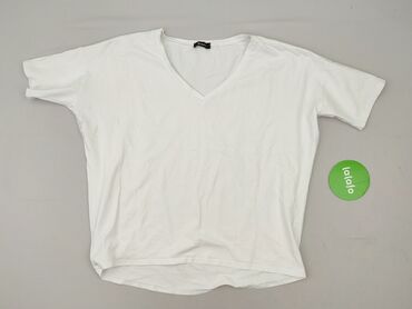Biała damska bluzka/T‑shirt z dekoltem w serek - Krój: luźny, swobodny, z krótkim rękawem typu kimono/opadające ramiona - Dekolt: głęboki V - Materiał: miękka, cienka dzianina bawełniana z dodatki...