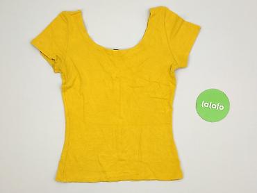 Żółta koszulka damska z krótkim rękawem - Fason: klasyczny T‑shirt, okrągły dekolt (rib) - Rozmiar z metki: M - Kolor: intensywny żółty - Materiał: miękka, przewiewna dzianina bawełniana (na zdjęc...