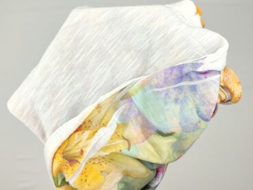 Damska koszulka z krótkim rękawem z lekkiej, cienkiej dzianiny. Przód w całości pokryty kolorowym nadrukiem w kwiaty (lilie) z artystycznym portretem kobiety; tył gładki, biały z delikatnie melanżową strukturą. Okrągły dekolt, lekko taliowany krój, rękawki typu cap. Materiał przewiewny, półprzezroczysty, miękki w dotyku – idealny na lato lub pod marynarkę. Żywe barwy i efekt akwareli nadają koszulce wyrazisty, artystyczny charakter. Idealna do jeansów, spódnic i stylizacji casual.