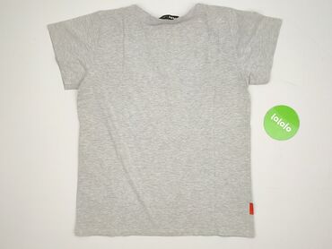 Szara koszulka damska z krótkim rękawem - Kolor: melanż szary - Krój: lekko wydłużony tył, dekolt w serek - Rękawy: krótkie, z lekkim bufowaniem - Nadruk: biały, małe logo/okrągły motyw z napisem ...