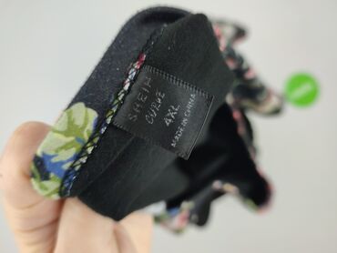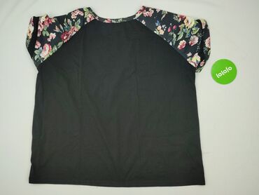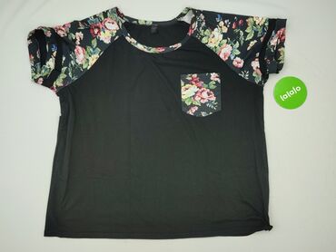 Damska koszulka z krótkim rękawem SHEIN, rozmiar 4XL. Klasyczny czarny przód i tył z kontrastowymi, raglanowymi rękawami w kwiatowy wzór. Na piersi naszyta kieszonka z tego samego, kwiatowego materiału; lamówka dekoltu również w ten sam wzór. Okrągły dekolt.