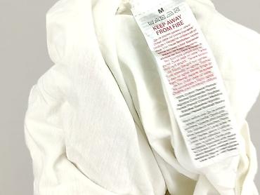 Biała koszulka damska z krótkim rękawem, rozmiar M. Klasyczny, okrągły dekolt. Z przodu delikatna, czarno‑szara grafika botaniczna (trzy szkice kwiatów) oraz napis „be proud of your progress”. Miękki, cienki materiał bawełniany przyjemny w noszeniu. Gładki tył bez nadruku. Idealna na co dzień do dżinsów, szortów lub pod kardigan. Dla kobiety, nie dla niemowlęcia. Stan z metki: WOMEN M. Instrukcje pielęgnacji na wszytej metce (m.in. ostrzeżenie „KEEP AWAY FROM FIRE”). Używana. Dla kobiety. Stan bardzo dobry.