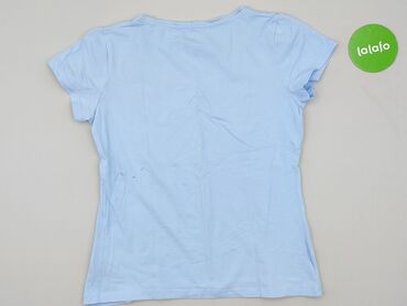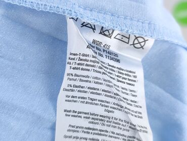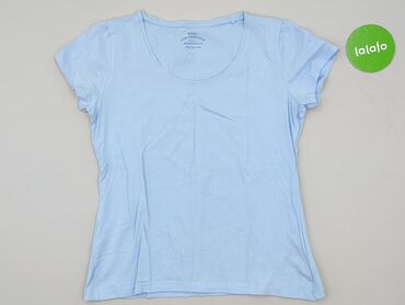 Damska koszulka JANINA - Model: t-shirt z krótkim rękawem - Rozmiar: L (widoczny na metce) - Krój: klasyczny, okrągły dekolt - Wzór: jasnoniebieskie tło w cienkie, poziome białe paski - Materiał: ...
