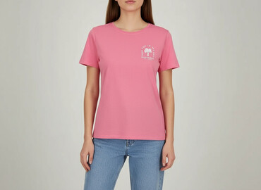 Różowa koszulka damska z krótkim rękawem - Kolor: intensywny róż - Krój: klasyczny T‑shirt, okrągły dekolt - Nadruk z przodu po lewej: biała palma i napis „HAVE FUN IN THE SUN • PALM BEACH • EST. ...