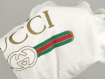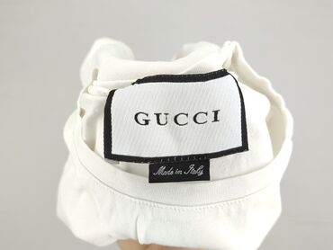- Model: klasyczny T‑shirt z przodu z dużym złotym napisem GUCCI i paskiem w barwach zielono‑czerwonych z emblematem GG
