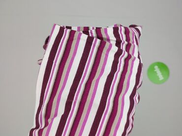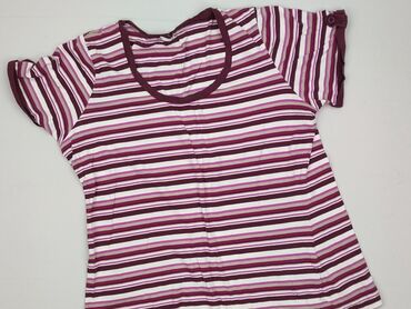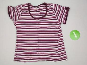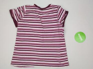 T-shirt damski Pamukkale, rozmiar M. - Krój: klasyczny, lekko dopasowany, krótki rękawek typu cap. - Dekolt: w kształcie litery V, obszyty fioletową lamówką. - Wzór: kolorowe, wąskie paski (fiolet...