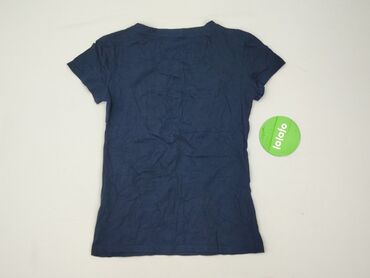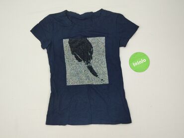 T-shirt damski, granatowo-niebieski (chabrowy), krótki rękaw. - Fason: dopasowany, z głębszym, zaokrąglonym dekoltem z przodu i z tyłu. - Rozmiar: M (oznaczenie „ROZMIAR M” na metce nadrukowanej). ...