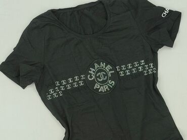 OkrągłyCzarna damska koszulka z krótkim rękawem, z okrągłym dekoltem. Przód zdobiony dużą aplikacją z drobnych dżetów w układzie okręgu oraz pasem z drobnymi wzorami „CC” biegnącym przez całą szerokość klatki piersiowej. Na jednym rękawie nadruk „CHANEL”. Tkanina elastyczna, cienka i miękka w dotyku (typ bawełna z domieszką elastanu). Krój dopasowany, długość sięgająca bioder.