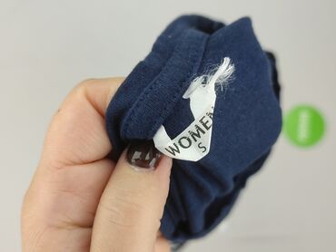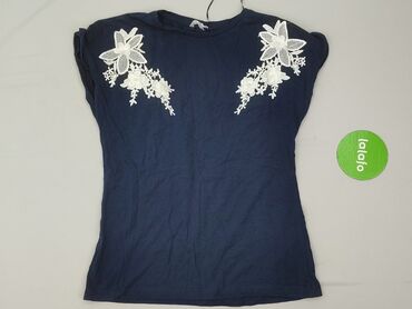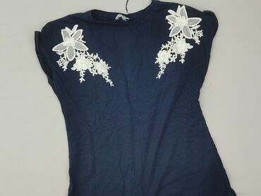 Granatowa koszulka damska WOMEN, rozmiar S. - Fason: luźny T-shirt z krótkim rękawem typu cap - Dekolt: w kształcie litery V - Kolor: melanż granatowy - Ozdoby: ażurowa koronkowa wstawka na ramien...