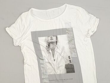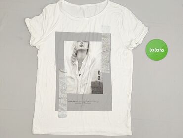 Biała damska koszulka z krótkim rękawem i okrągłym dekoltem. Na przodzie nadruk artystyczny: postać kobiety w pozycji odwróconej, w czarno‑czerwonej kolorystyce, poniżej wiaderko – nadruk w stylu i...