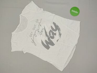 Biała damska koszulka z krótkim rękawem i okrągłym dekoltem. Na przodzie nadruk artystyczny: postać kobiety w pozycji odwróconej, w czarno‑czerwonej kolorystyce, poniżej wiaderko – nadruk w stylu i...Stan: