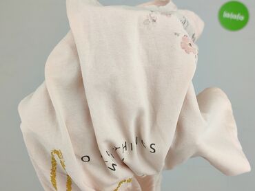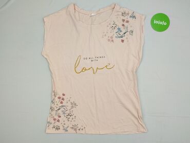 OkrągłyBladoróżowa damska koszulka z krótkim rękawem typu cap. Na przodzie nadruk: „DO ALL THINGS WITH love” – słowo „love” złotą, lekko połyskującą czcionką. Delikatny, kwiatowy nadruk w pastelowych kolorach (róże, niebieskości) przy ramieniu i w dolnej części koszulki. Okrągły dekolt, luźniejszy fason.