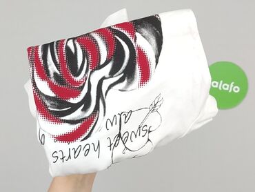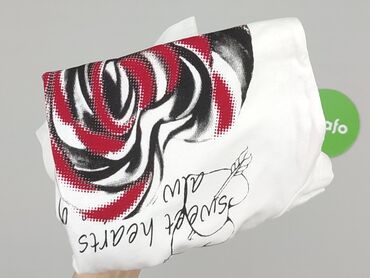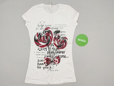 Biała koszulka damska z nadrukiem serca. Nadruk w kolorze czerwonym, niebieskim i różowym przedstawia serce z napisami takimi jak „sensual”, „beautiful”, „passion”, „emotion”, „sweet forever”, „lov...