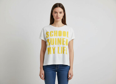 Koszulka damska Reserved YFL - Kolor: biały - Duży żółty nadruk z przodu: „SCHOOL RUINED MY LIFE” - Krój: luźny, z krótkim rękawem, zaokrąglony dół dłuższy z tyłu - Dekolt: okrągły - Rozmiar z met...