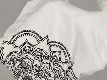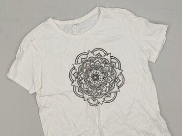 Biała koszulka damska z krótkim rękawem. Na przodzie koszulki znajduje się ozdobny nadruk w formie okręgu, wzorowany na mandali lub łapaczu snów, z elementami w kolorze złotym i srebrnym. Okrągły d...Stan: