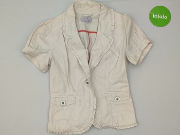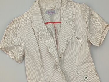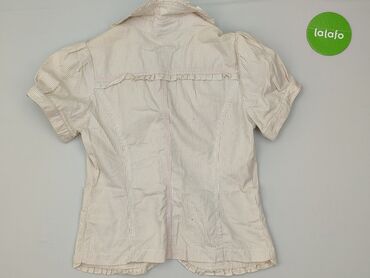 Beżowa damska marynarka/koszula z krótkim rękawem - Fason: dopasowany, z wydłużonym, szpiczastym dołem z przodu i tyłu - Zapięcie: 4 guziki z przodu - Kołnierz: klasyczny, z połyskującą satynową w...