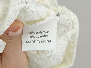 Biała damska bluzka z krótkim rękawem i efektowną koronką przy dekolcie w kształcie litery V. - Rozmiar: M (z metki) - Skład: 95% poliester, 5% spandex – materiał gładki, miękki, lekko elastyczny ...