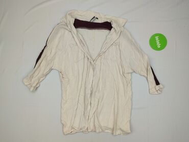 Bluzka damska w kolorze jasnego beżu/ecru. - Fason: luźny, koszulowy, z zaokrąglonym dołem (dłuższy tył). - Dekolt: okrągły z miękką, dekoracyjną klapą/kołnierzykiem. - Zapięcie: ukryta listwa z g...Stan: