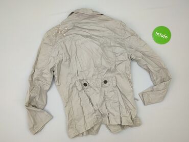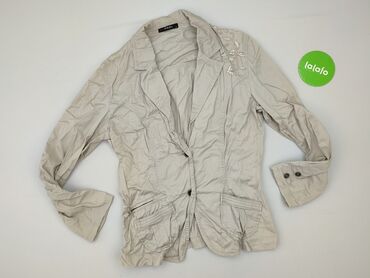 Beżowa marynarka damska z bawełny - Materiał: 100% bawełna (metka “100% BAWEŁNA”) - Krój: taliowany, podkreślający sylwetkę - Zapięcie: 3 guziki z tłoczeniem kwiatowym - Kołnierz: klasyczne, szpic...