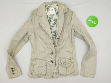 Beżowa marynarka damska z bawełny - Materiał: 100% bawełna (metka “100% BAWEŁNA”) - Krój: taliowany, podkreślający sylwetkę - Zapięcie: 3 guziki z tłoczeniem kwiatowym - Kołnierz: klasyczne, szpic...